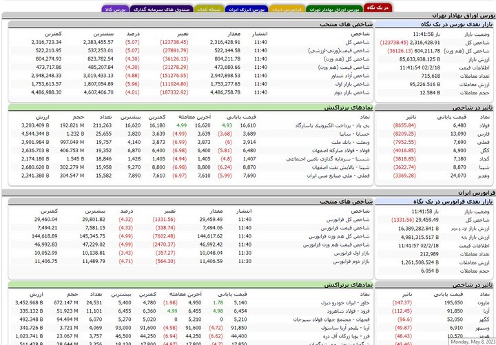 گفتنی است سه نماد فولاد، فارس و فملی بیشترین تاثیر در شاخص کل بورس و سه نماد مارون، آریا و کگهر بیشترین تاثیر را در شاخص فرابورس داشته اند.