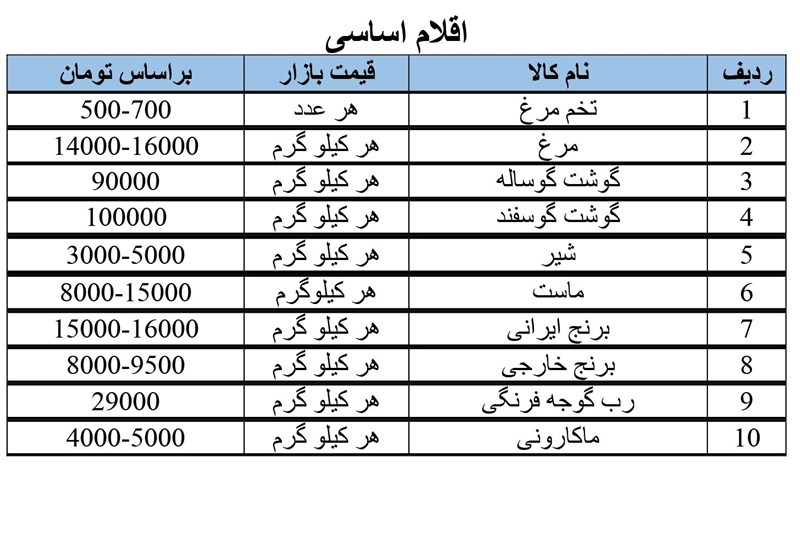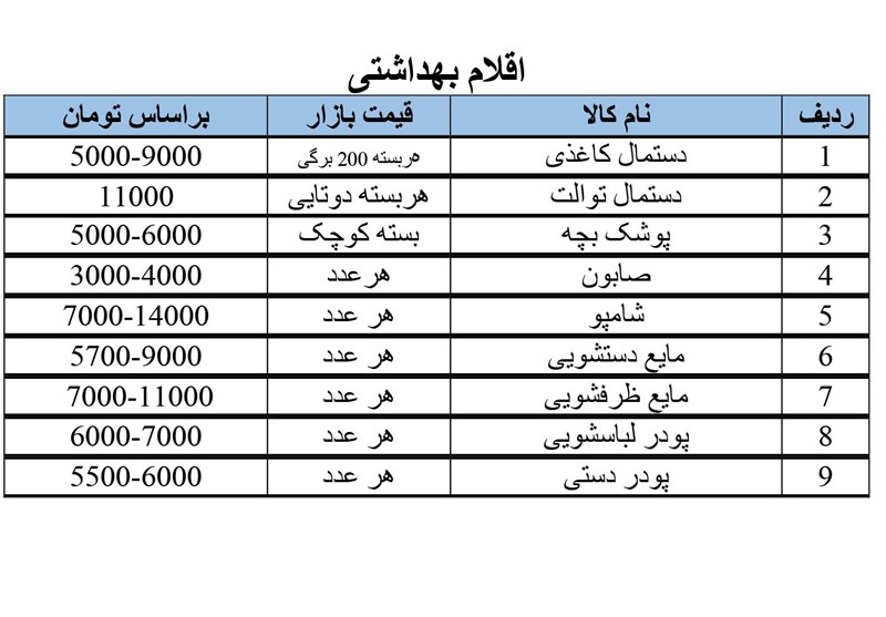 قیمت این کالا ها به شرح زیر است: