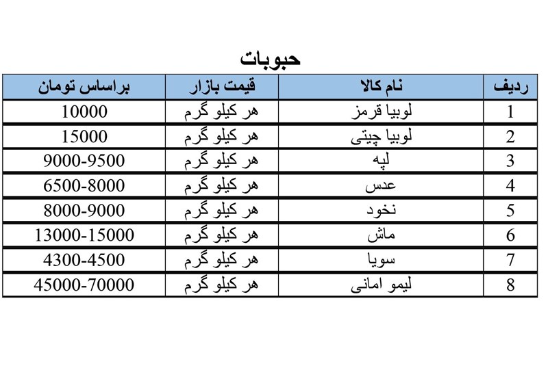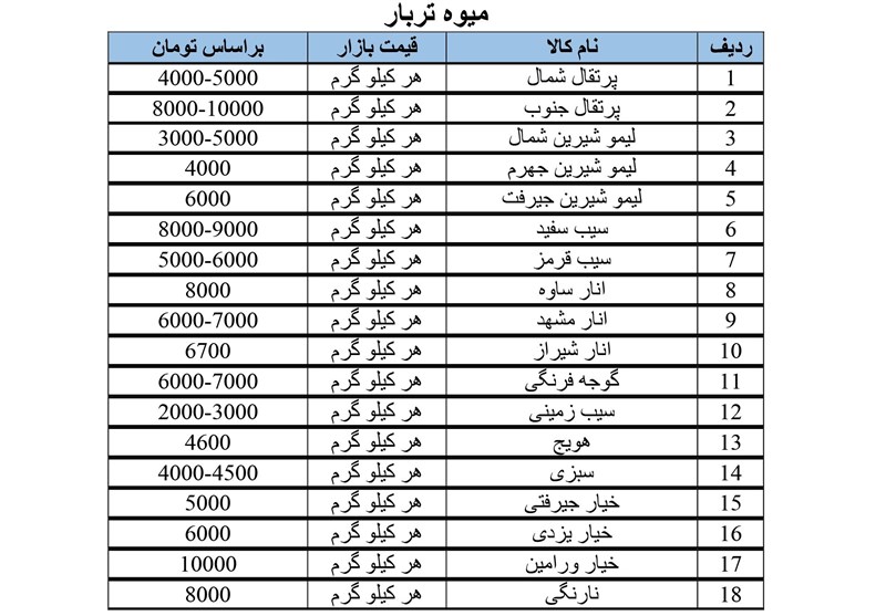 قیمت میوه تربار, حبوبات و انواع مواد پروتئینی در سطح بازار شهر ارومیه را منتشر شد.