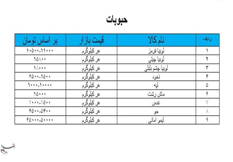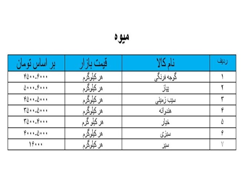 قیمت میوه, حبوبات, و مواد پروتئینی در ارومیه; سه‌شنبه ۱۰ اردیبهشت‌ماه+جدول