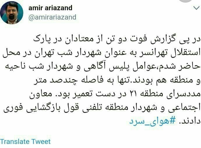 وی در صحفه شخصی خود در تویتر نوشت: در پی گزارش فوت دو تن از معتادان در پارک استقلال تهرانسر به عنوان شهردار شب تهران در محل حاضر شدم، عوامل پلیس آگاهی و شهردار شب ناحیه و منطقه هم بودند.تنها به فاصله چندصدمتر مددسرای منطقه 21 در دست تعمیر بود.معاون اجتماعی و شهردار منطقه تلفنی قول بازگشایی فوری دادند.