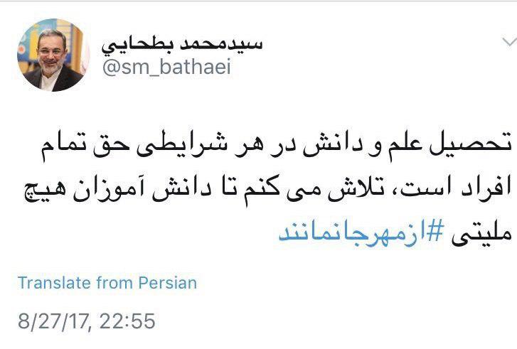 سيد محمدبطحايى وزير آموزش و پرورش، پس از توييت هاى كاربران ايرانى توييتر، در حمايت از كودكان بازمانده از تحصيل افغان در ايران این متن را نوشت.