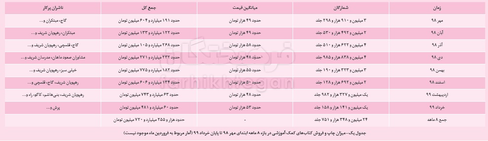 در اطلاعات موجود و جداول منتشرشده از کتابهای کمکآموزشی منتشرشده در بازه زمانی اول مهرماه ۹۸ تا پایان خردادماه ۹۹ علاوهبر شمارگان اطلاعات تکمیلی دیگری هم هست که برای جلوگیری از مطول شدن گزارش صرفا به بخشی از آنها همچون میانگین قیمت هر جلد کتاب و ناشران پرکار اشاره میکنیم. طبق محاسبات انجامشده، درآمد حاصل از فروش کتابهای کمکآموزشی در این بازه هشت ماهه چیزی بیش از هزار و ۲۵۵ میلیارد و ۷۲۰ میلیون تومان بوده و چنین عدد بزرگی بهسمت جیب مدیران و مالکان ناشران کمکآموزشی سرازیر شده است. گاج، قلمچی، رهپویان شریف، مبتکران، راه، خیلی سبز و پرش همواره و در ماههای مختلف جزء پرکارترین ناشران کمکآموزشی بوده و در جدول ۱۰ ناشر پرکار هر ماه حضور داشتهاند. با این اوصاف میتوانید جزئیات انتشار کتب کمکآموزشی را در جدول شماره یک مشاهده کنید.
