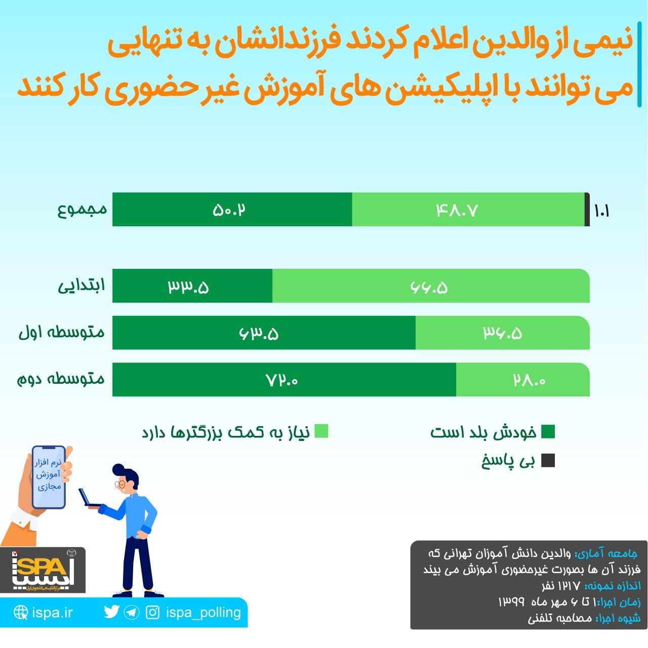 مرکز افکارسنجی دانشجویان ایران در نظرسنجی دیگری از والدین دانش آموزان تهرانی پرسیده است «آیا فرزند شما به تنهایی میتواند با اپلیکیشن های آموزش غیرحضوری کار کند یا نیاز به کمک بزرگترها دارد؟» ۵۰.۲ درصد بیان کردند فرزندشان به تنهایی میتواند با اپلیکیشن ها کار کند اما ۴۸.۷درصد گفتند فرزندشان به کمک نیاز دارد.