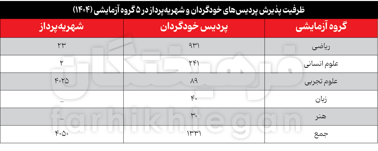 بر اساس دفترچه انتخاب رشته امسال، در مجموع 5 گروه آزمایشی بدون در نظر گرفتن اصلاحات صورت گرفته برای رشته محل‌ها به ویژه در حوزه پزشکی و دندانپزشکی که امروز منتشر می‌شود، قرار است 5 هزار و 381 نفر در پردیس‌های خودگردان و در دوره‌های شهریه‌پرداز پذیرش شوند. از این میزان هزار و 331 ظرفیت برای پردیس‌های خودگردان در نظر گرفته شده است. جالب اینکه در این بین گروه آزمایشی علوم ریاضی نیز با 931 نفر سهم 70 درصدی در پذیرش دانشجویان خودگردان خواهد داشت. بعد از آن علوم انسانی‌ها هستند که با سهم 18 درصدی در رتبه دوم قرار گرفته‌اند و طبیعتاً علوم تجربی‌ها هم در رتبه سوم قرار دارند. با این حال این گروه بالاترین میزان پذیرش دانشجو در دوره‌های شهریه‌پرداز را به خود اختصاص داده است، به طوری که از مجموع 4 هزار و 50 نفر، 4 هزار و 25 دانشجویی که بناست در دوره‌های شهریه‌پرداز پذیرش شوند، مربوط به گروه علوم تجربی است. اگر بخواهیم نگاهی جزئی‌تر به این حوزه داشته باشیم، باید عنوان ظرفیت پذیرش دانشجو در پردیس دانشگاه شهید بهشتی برای امسال 220 دانشجو، امیرکبیر 307، صنعتی شریف 621 نفر و تهران نیز 720 دانشجو اعلام شده است. با وجود اینکه محمدحسین امید، رئیس این دانشگاه مرداد امسال از کاهش تعداد پردیس‌ها صحبت کرده بود، اما با در نظر گرفتن افزایش 120 نفری ظرفیت امسال این دانشگاه در مقایسه با سال قبل، به نظر می‌رسد علی‌رغم این وعده، اما پردیس‌های ارس و کیش دانشگاه تهران قرار است بیشتر از گذشته پای کار این دانشگاه باشند.