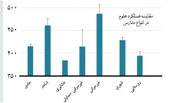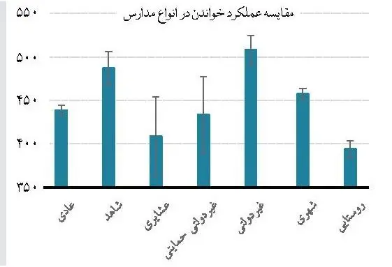 چنانکه در نمودار مشخص است، در مقایسه انواع مدارس، بهترین عملکرد را دانشآموزان مدارس غیردولتی نشان دادهاند؛ میانگین این گروه ۵۲۱ بوده و بهطور معناداری عملکرد بهتری نسبت به سایر دانشآموزان داشتهاند. پس از این مدارس، دانشآموزان مدارس شاهد قرار دارند. تفاوت عملکرد این گروه با سایر دانشآموزان نیز معنادار است (بهجز تفاوت با دانشآموزان مدارس غیردولتی حمایتی به دلیل فاصله اطمینان بالای این گروه).