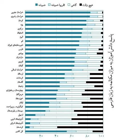 این وضعیت در استانهای مختلف متفاوت است. بهعنوان نمونه، در استانهای خراسان جنوبی و رضوی، ۸۳ درصد از دانشآموزان همیشه به فارسی صحبت میکنند، درحالیکه در استانهای کردستان، آذربایجان شرقی و آذربایجان غربی به ترتیب ۵، ۶ و ۷ درصد دانشآموزان همیشه به فارسی صحبت میکنند که کمترین نسبت در کل کشور است.