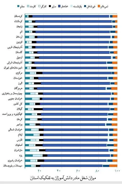 شغل ۵ درصد از مادران دانشآموز معلم، ۵ درصد کارمند، ۵ درصد سایر مشاغل و ۲ درصد کارگر است. همچنین، مادران یک درصد از دانشآموزان بازنشسته و ۵ درصد غیرشاغل هستند. شغل بخش اعظم مادران دانشآموز خانهدار بود (۷۴ درصد). علاوهبراین، ۴ درصد از دانشآموزان از شغل مادر خود اطلاعی نداشتند. مادران دانشآموز در استانهای یزد، مازندران، خراسان رضوی، خراسان شمالی، ایلام و فارس دارای بیشترین نرخ اشتغال هستند که بیش از ۲۰ درصد دانشآموزان برآورد میشود. از طرف دیگر، کمترین میزان اشتغال مادران در کردستان با ۸ درصد از دانشآموزان به دست آمده است. از لحاظ مادران خانهدار نیز بالاترین نرخ مادران خانهدار در استانهای کردستان، کرمانشاه، زنجان و قم (با بیش از ۸۰ درصد دانشآموزان) هستند.
