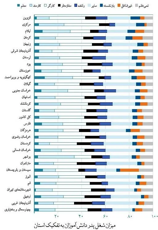 شغل ۴ درصد از پدران کل دانشآموزان معلم، ۱۷ درصد کارمند، ۲۲ درصد کارگر، ۱۱ درصد مغازهدار، ۸ درصد راننده و ۲۲ درصد سایر مشاغل است. همچنین، ۴ درصد از پدران بازنشسته و ۵ درصد غیرشاغل هستند. ۸ درصد از دانشآموزان نیز شغل پدر خود را نمیدانستند. بیشترین نسبت پدران شاغل در اردبیل گزارش شده است که بیش از ۹۰ درصد پدران دانشآموزان شاغل بودهاند. کمترین نسبت هم به استان سیستان و بلوچستان مربوط است که پدرانِ کمتر از ۷۰ درصد دانشآموزان شاغل بودند. در البرز و مرکزی کمترین میزان پدران بیکار (کمتر از ۳ درصد) گزارش شده است و بیشترین نرخ پدران بیکار در سیستان و بلوچستان است که در آن ۱۶ درصد از پدران بیکار هستند. فاصله قابلتوجهی بین این نسبت و استان بعد وجود دارد. از نکات قابلذکر دیگر در این تحلیل میتوان به بیشترین نسبت پدران کارگر در شهرستانهای تهران (۳۳ درصد) اشاره کرد.