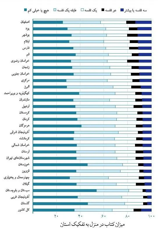 بر اساس این دادهها، ۳۵ درصد از دانشآموزان (بیش از یکسوم) اعلام کردهاند که هیچ یا تقریباً هیچ کتابی در منزل ندارند. ۳۱ درصد بهاندازه یک طبقه از قفسه کتاب (۱۱ تا ۲۵ جلد)، ۱۸ درصد یک قفسه کامل، ۷ درصد دو قفسه و ۸ درصد سه قفسه یا بیشتر کتاب در منزل دارند. در مقایسه وضعیت وجود کتاب در منزل، دانشآموزان استان اصفهان وضعیت بهتری نسبت به سایر استانها دارند؛ بهطوریکه ۱۳ درصد از آنها گفتهاند سه قفسه یا بیش از سه قفسه کتاب در منزل دارند. این نسبت در استانهای گلستان، آذربایجان غربی و سیستان و بلوچستان کمتر از سایر استانهاست؛ بهگونهای که کمتر از ۵ درصد از دانشآموزان به وجود بیش از سه قفسه کتاب در منزل اشاره کردهاند. از نظر نبود کتاب در منزل، بدترین وضعیت مربوط به استانهای سیستان و بلوچستان، گلستان، خوزستان و هرمزگان است؛ بهطوریکه بیش از ۴۰ درصد از دانشآموزان گزارش دادهاند که هیچ یا تقریباً هیچ کتابی در منزل ندارند. این نسبت در استان سیستان و بلوچستان به ۵۴ درصد نیز میرسد که نشاندهنده فقر فرهنگی خانوارهاست.
