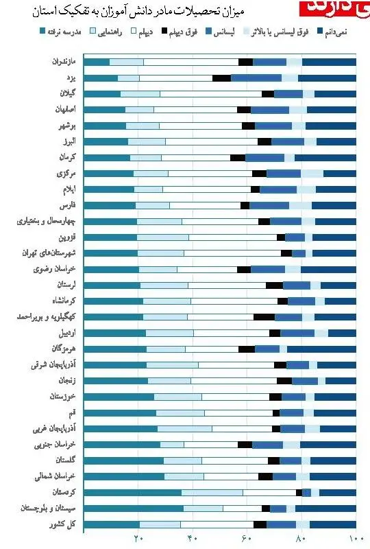 از نظر مادران دارای تحصیلات دانشگاهی، استان یزد پیشتاز است؛ بهگونهای که بیش از ۳۰ درصد از دانشآموزان دارای مادری با مدرک دانشگاهی هستند (به ترتیب ۳۳ و ۳۱ درصد). در مقابل، در استان کردستان تنها ۹ درصد از دانشآموزان مادرانی با تحصیلات دانشگاهی دارند.