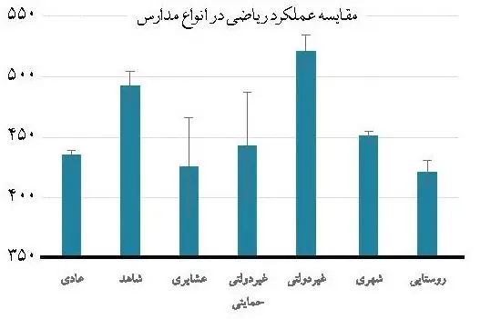 در این مطالعه مدارس بر اساس سه معیار طبقهبندی شدند: نوع مالکیت و مدیریت (عادی، شاهد، عشایری، غیردولتی و غیردولتی حمایتی)، جنسیت دانشآموزان (دخترانه، پسرانه و مختلط) و موقعیت جغرافیایی (شهری و روستایی). برای مقایسه عملکرد ریاضی در انواع مختلف مدارس، سه تحلیل جداگانه انجام گرفت. نتایج این تحلیلها در نمودار نمایش داده شده است. این نمودار نشان میدهد عملکرد ریاضی دانشآموزان ایرانی بهطور میانگین پایینتر از حد متوسط استاندارد جهانی قرار دارد؛ حدود نیم انحراف (50 نمره) استاندارد پایینتر از نقطه میانگین.