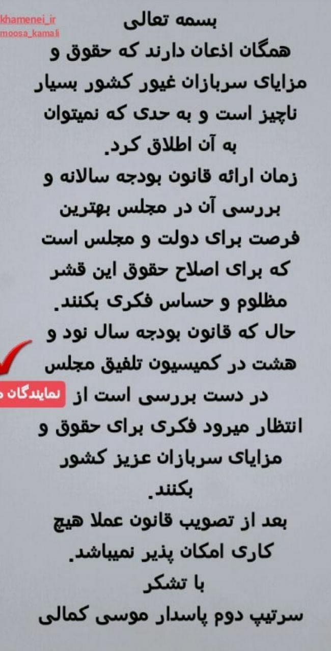 درخواست سردار کمالی از نمایندگان مجلس برای اصلاح حقوق سربازان