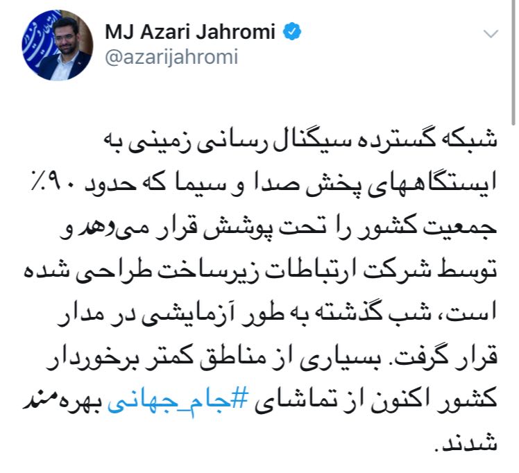 آذري جهرمي در روز آغاز جام جهاني در مورد اقدام مهم وزارت ارتباطات نوشت: بسياري از مناطق كمتر برخوردار كشور، اكنون از تماشاي جام جهاني بهره مند شدند.