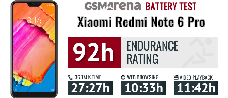 شیائومی ردمی نوت 6 پرو شباهات زیادی با شیائومی ردمی نوت 5 AI دارد و نتیجه کلی تست باتری هر دو نیز عدد 92 ساعت است اما عملکرد باتری ردمی نوت 6 پرو در پخش ویدیو، وبگردی و مدت زمانه مکالمه به مقدار قابل توجهی کمتر است. مثلا مدت زمان وبگردی 3 ساعت، مدت زمان پخش ویدیو 2 ساعت و مدت زمان مکالمه نیز حدود دو ساعت!