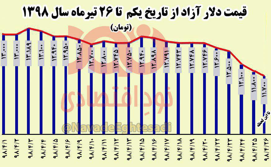 در حالی قیمت دلار در یکم تیرماه امسال ۱۳ هزار تومان بود که این نرخ هم اکنون و در تاریخ بیست و ششم تیرماه یعنی در فاصله کمتر از ۲۶ روز به رقم ۱۱۷۰۰ تومان رسید و حدود ۱۳۰۰ تومان کاهش یافت.