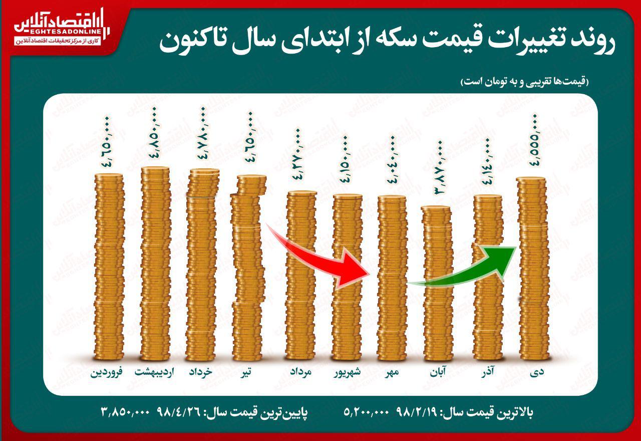 بهای سکه در این مدت از چهار میلیون و ۶۵٠هزار تومان به چهار میلیون و ۵۵۰ هزار تومان رسیده است.