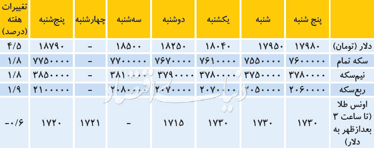 دلار هفته گذشته نه تنها کانال ۱۸ هزار تومانی را با قدرت شکست، بلکه در ۲ روز کاری انتهایی هفته به مرز ۱۹ هزار تومانی نزدیکتر شد. روز سهشنبه، شاخص بازار ارز ۲۵۰ تومان افزایش را تجربه کرد و به بهای ۱۸ هزار و ۵۰۰ تومان رسید. تعطیلی روز چهارشنبه هم بازار را آرام تر نکرد و روز پنجشنبه این ارز با ۲۹۰ تومان رشد به بهای ۱۸ هزار و ۷۹۰ تومان رسید. چنین رشدهایی موجب شدند که قیمت دلار در هفتهای که گذشت حدود ۵/ ۴ درصد افزایش پیدا کند؛ حال آنکه در بازار فلزات گرانبهای داخلی، سهم سکه تمام طی آخرین هفته خرداد ۸/ ۱ درصد رشد بود.