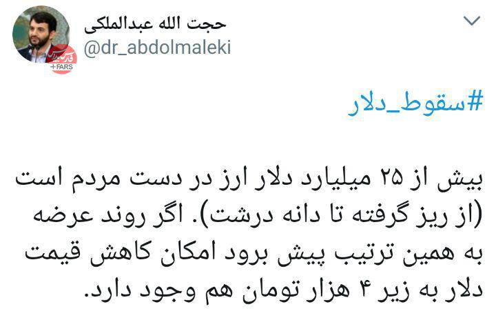 عبدالملکی در حساب توئیتری خود نوشت: بیش از 25 میلیارد دلار ارز در دست مردم است (از ریز گرفته تا دانه درشت). اگر روند عرضه به همین ترتیب پیش برود امکان کاهش قیمت دلار به زیر 4 هزار تومان هم وجود دارد.