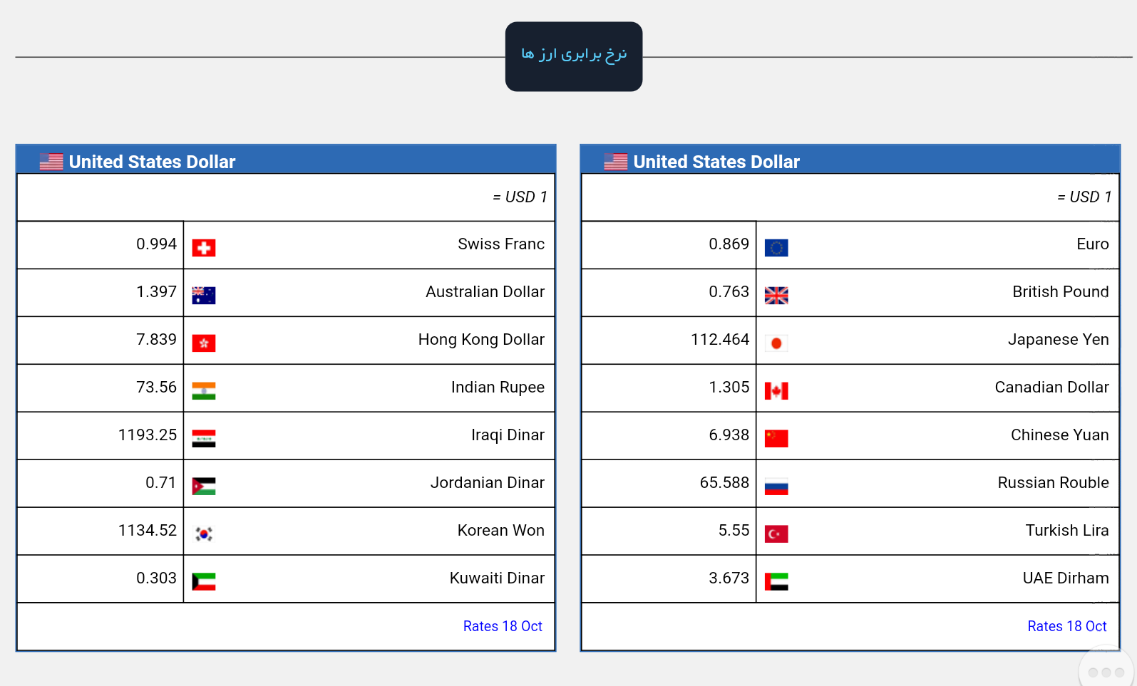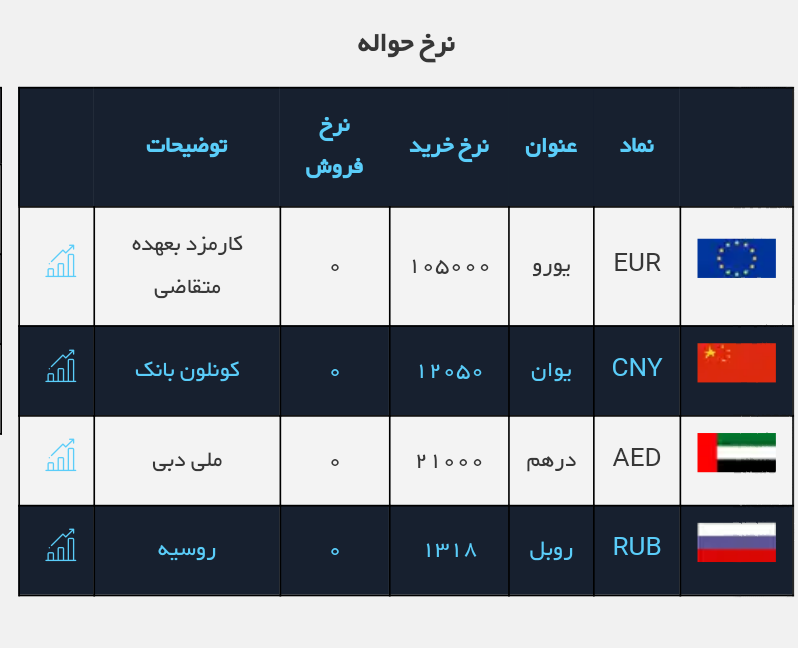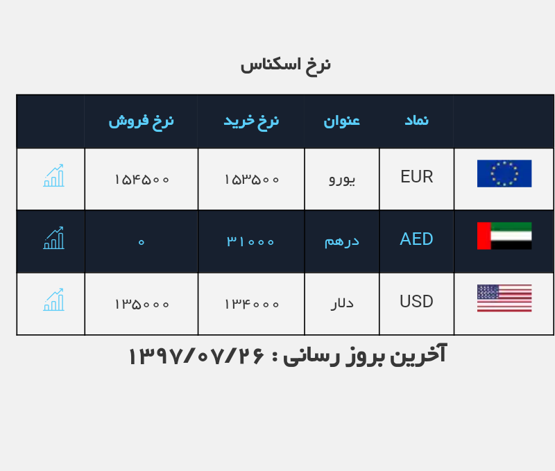در جدول زیر نرخ اسکناس، حواله و نرخ برابری ارزها را مشاهده می کنید.
