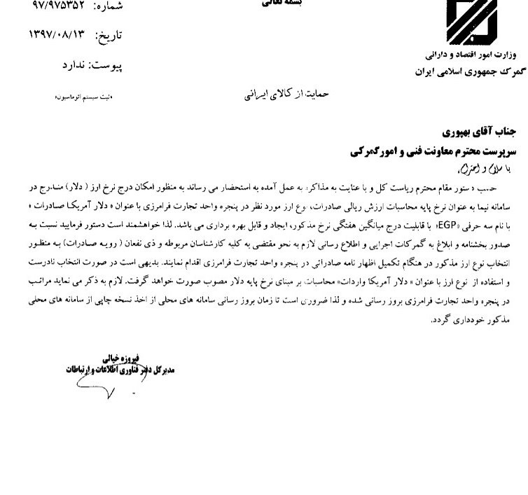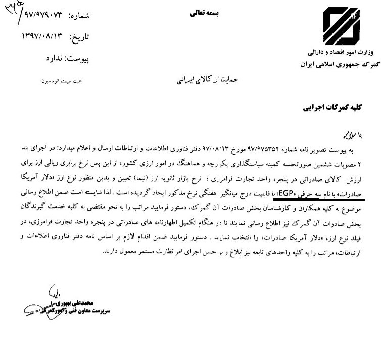 بر اساس بخشنامه، سرپرست معاونت فنی گمرک ایران و بر اساس نامه دفتر فن اوری اطلاعات این سازمان، واحد ارزی جدید " دلار امریکا صادرات" با کد اختصاری "EGP" بر مبنای میانگین هفتگی نرخ دلار بازار ثانویه (نیما) برای ارزش کالاهای صادراتی و لزوم انتخاب گزینه مذکور در باکس 22 اظهارنامه های صادراتی ایجاد شده است.