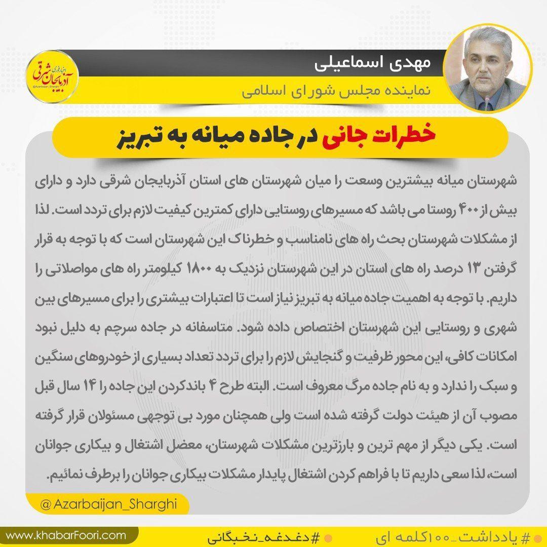 یک نماینده مجلس شورای اسلامی از خطرات جانی در جاده میانه به تبریز خبر داد.