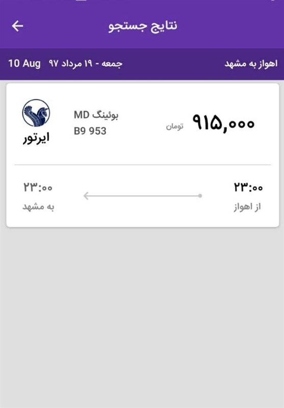طبق گزارشات واصله از مخاطبان بلیط هواپیمای امروز اهواز به مشهد تا مرز 1 میلیون تومان رسید و این درحالی است که در روزهای معمولی قیمت بلیط از 200 تومان تا 400 هزار تومان نوسان دارد.