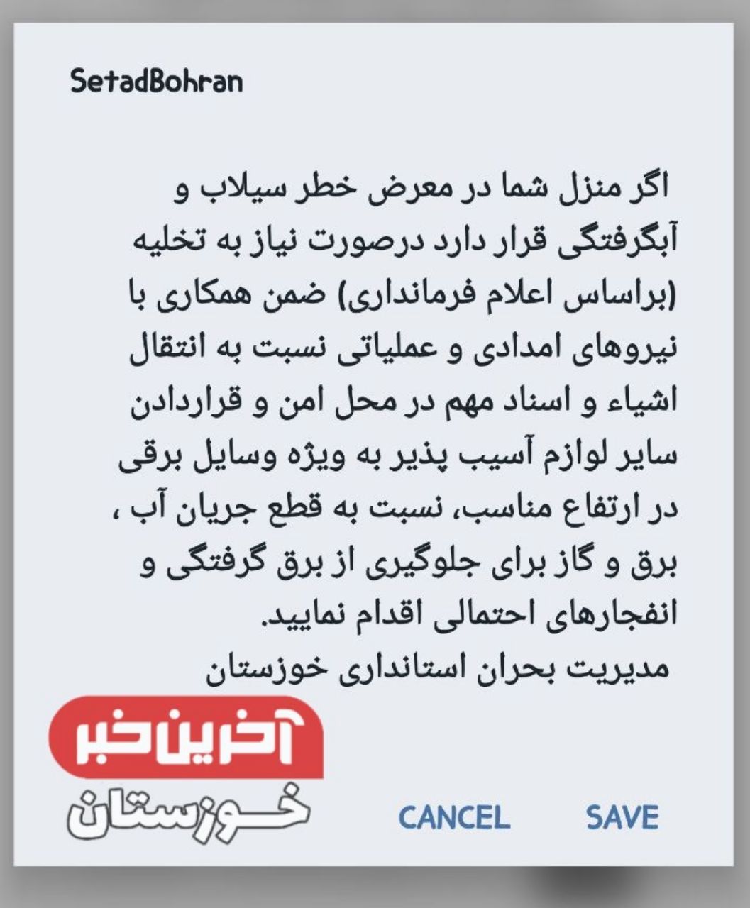پیامک فوری ستاد مدیریت بحران برای هشدار به مردم خوزستان+عکس