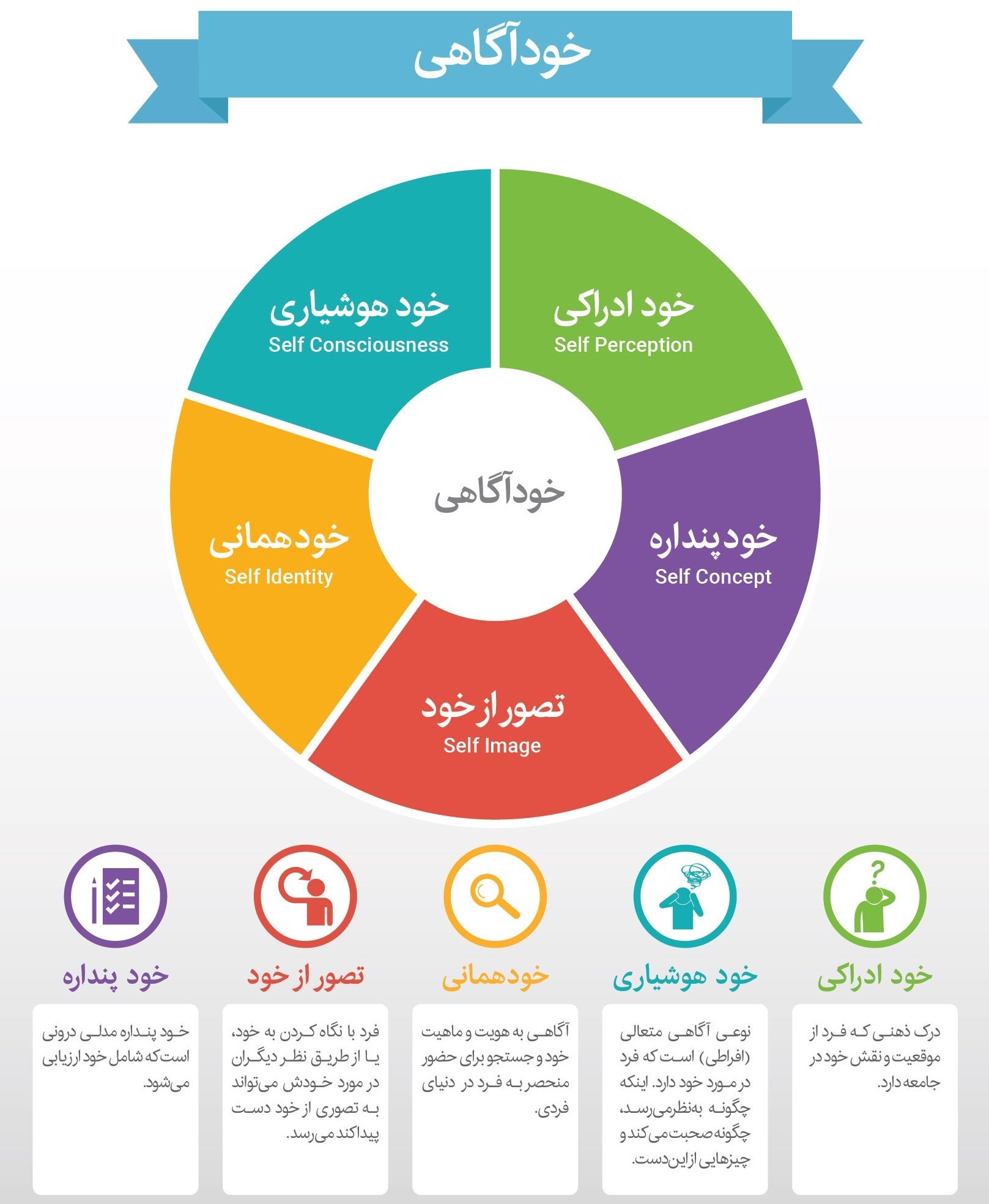 در اینفوگرافیک زیر پنج جزو مهم در خودآگاهی به تصویر کشیده شده است که در شناخت از خود کمک زیادی میکند.