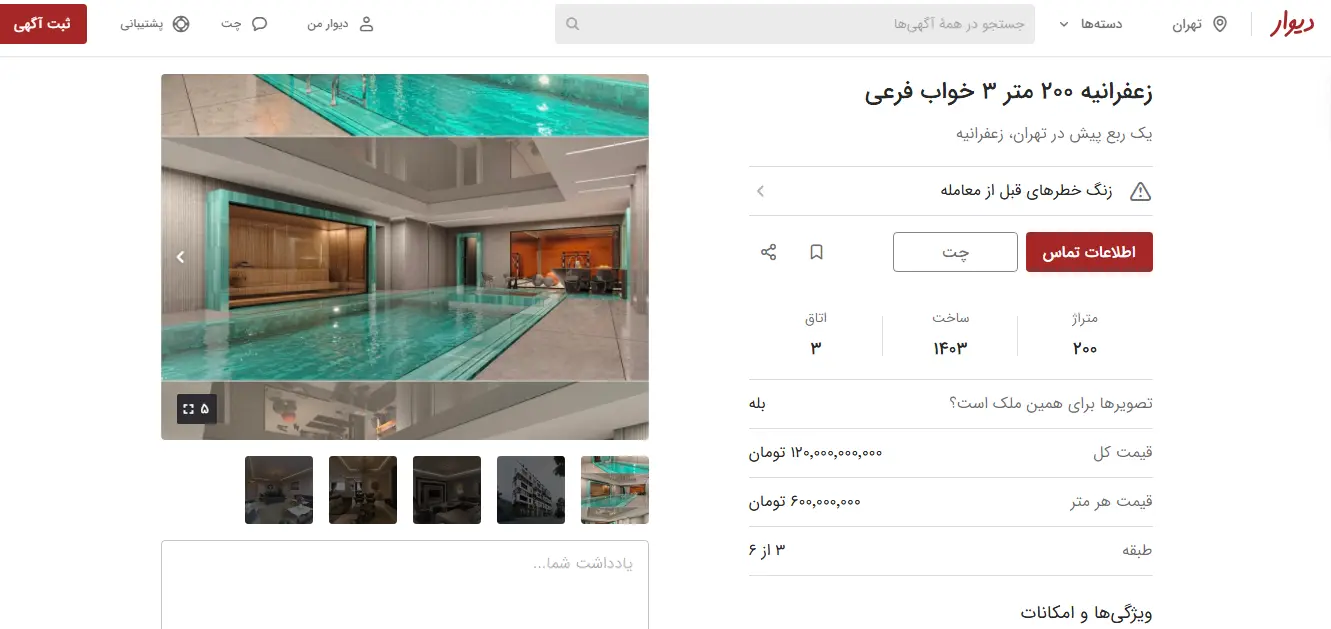 در زعفرانیه قیمتها از این هم بالاتر است. یک واحد ۲۰۰ متری یک سال ساخت ۱۲۰ میلیارد تومان و هر متر مربع آن ۶۰۰ میلیون تومان قیمت خورده است.