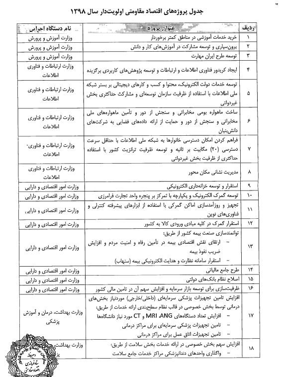 طبق این ابلاغیه ۱۹ دستگاه شامل وزارت آموزش و پرورش، وزارت ارتباط و فناوری اطلاعات، وزارت امور اقتصاد و دارایی، وزارت بهداشت، درمان و آموزش پزشکی، وزارت تعاون، کار و رفاه اجتماعی، وزارت جهاد کشاورزی، وزارت راه وشهرسازی، وزارت صنعت، معدن و تجارت، وزارت کشور، وزارت نفت، وزارت نیرو، معاونت علمی و فناوری رئیس جمهور، سازمان برنامه و بودجه کشور، سازمان اداری و استخدامی کشور، بانک مرکزی، سازمان میراث فرهنگی، صنایع دستی و گردشگری، دبیرخانه شورای عالی مناطق آزاد تجاری-صنعتی ویژه اقتصادی، سازمان حفاظت محیط زیست و معاونت توسعه روستایی و مناطق محروم کشور در سال جاری دارای پروژه اولویت دار خواهند بود.