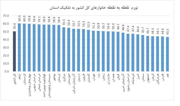 در خرداد ماه ١٣٩٨ عدد شاخص کل برای خانوارهای کشور (١ =١٣٩٥) به ١٧٤,٩ رسید که نسبت به ماه قبل .٨ درصد افزایش نشان میدهد. در این ماه بیشترین نرخ تورم ماهانه خانوارهای کشور مربوط به استان های گیلان و هرمزگان با ٢. درصد افزایش و کمترین نرخ تورم ماهانه مربوط به استان آذربایجان غربی با ٢.٢ درصد کاهش می­باشد. درصد تغییر شاخص کل نسبت به ماه مشابه سال قبل (تورم نقطه به نقطه) برای خانوارهای کشور ٥ .٤ درصد می­باشد. بیشترین نرخ تورم نقطه به نقطه مربوط به استان ایلام (60.3 درصد) و کمترین آن مربوط به استان قم (٤٣.٣ درصد) است. یعنی خانوارهای ساکن استان ایلام به طور متوسط ٩.٩ درصد بیشتر از میانگین کل کشور و خانوارهای ساکن استان قم به طور متوسط ٧.١ درصد کمتر از میانگین کل کشور نسبت به خرداد ١٣٩٧ برای خرید یک «مجموعه کالا و خدمات یکسان» هزینه کرده اند. نرخ تورم دوازده ماهه منتهی به خرداد ماه ١٣٩٨ برای خانوارهای کشور به عدد ٣٧.٦ درصد رسید. بیشترین نرخ تورم دوازده ماهه مربوط به استان کردستان (٤٥.١ درصد) و کمترین آن مربوط به استان­ قم (٣١.٤ درصد) است. شکاف نرخ تورم دوازده ماهه استان ها در خرداد ماه ١٣.٧ درصد است که نسبت به ماه قبل ١.٣ واحد درصد افزایش نشان می­دهد.