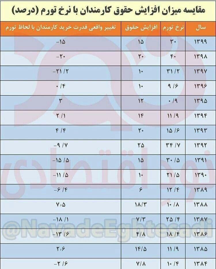 مقایسه میزان افزایش حقوق کارمندان با نرخ تورم نشان میدهد که قدرت خرید کارمندان کاهش یافته است.