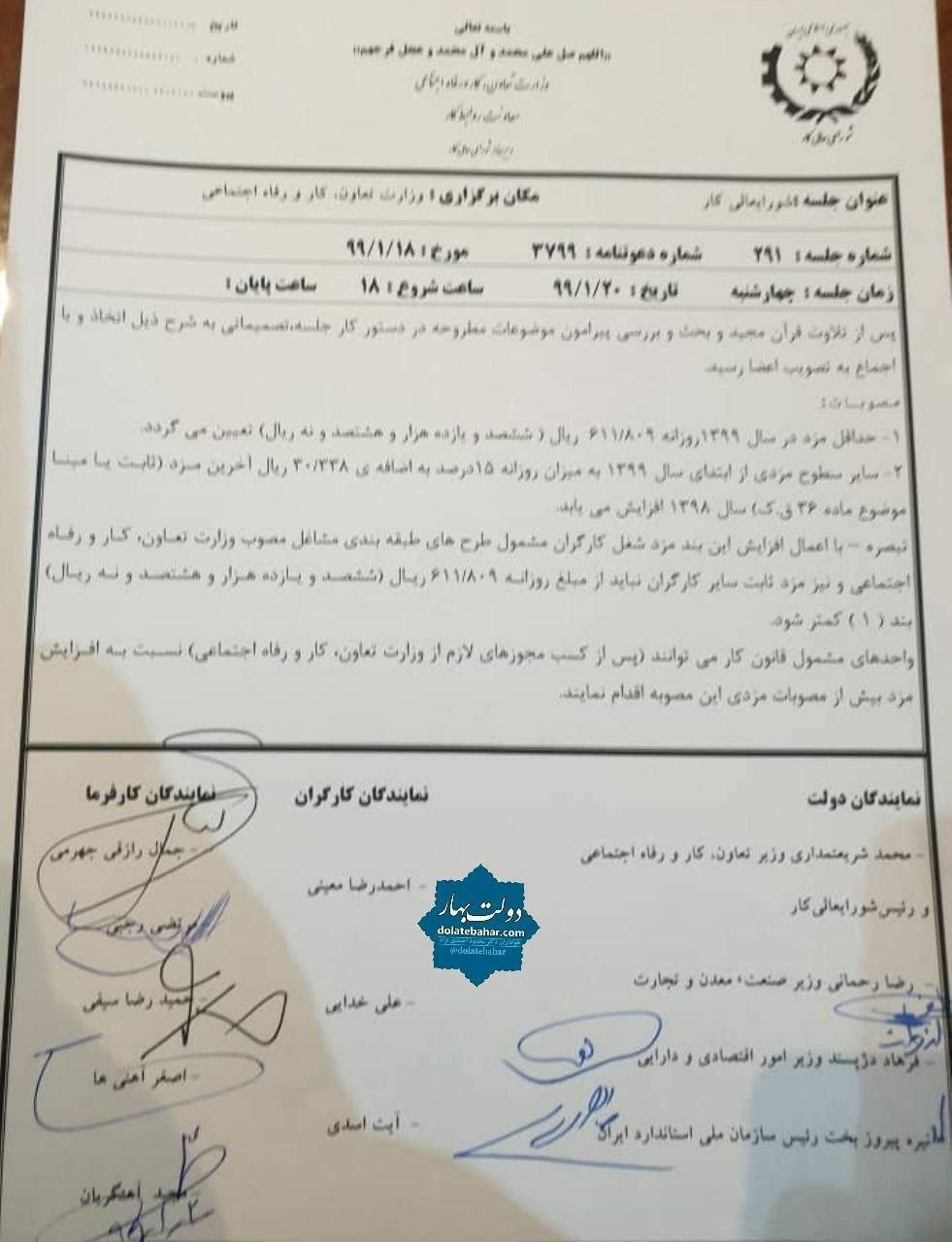 این تصمیم که نمایندگان انرا امضا نکردن مشروحیت ندارد اگراینطورباشد دبگه برای هیچ جلسی ای ازنمایندگان دعوت نشود متشکرم وزیرکارونماینده کارفرمایکه تازجلسه بودن کارگرمساوی باصفر