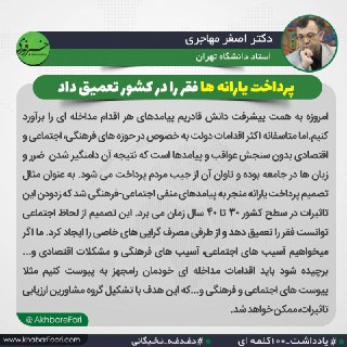 دکتر اصغر مهاجری استاد دانشگاه تهران در #دیدگاه_نخبگانی و یادداشت اختصاصی برای خبرفوری نوشت: یارانه منجر به پیامدهای منفی اجتماعی-فرهنگی شد که زدودن این تاثیرات در سطح کشور ۳۰ تا ۴۰ سال زمان میبرد