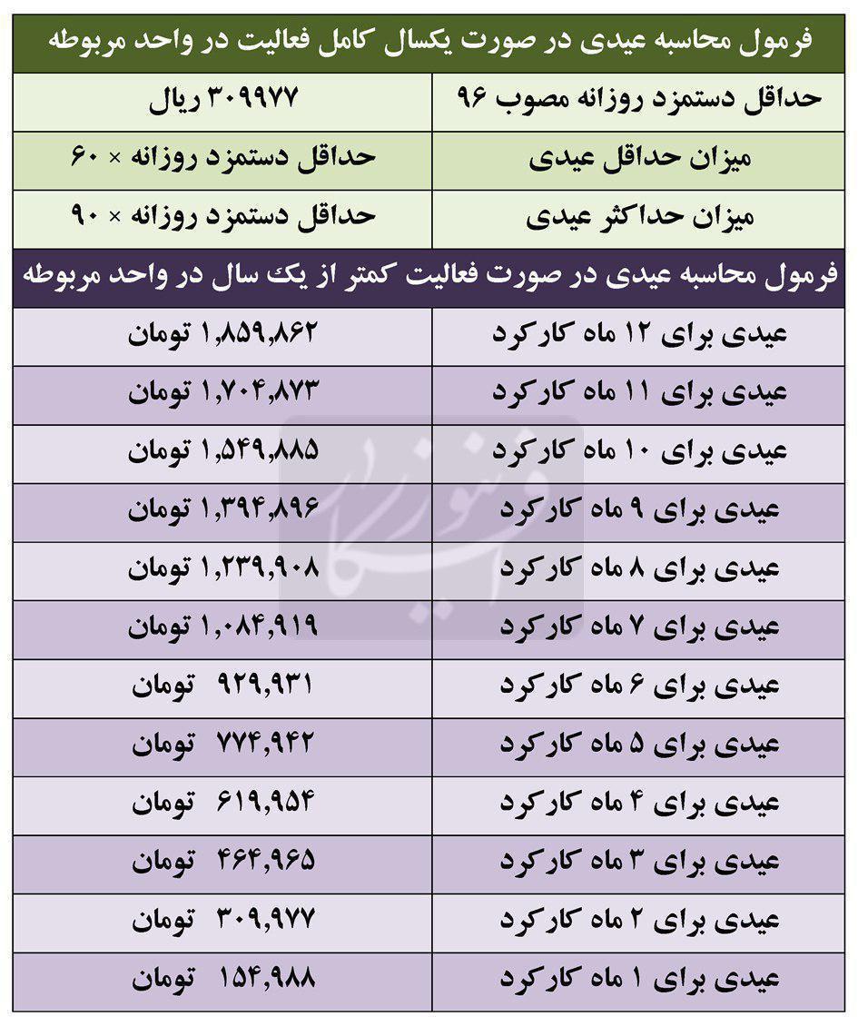 محاسبه عیدی بر حسب حداقل دستمزد روزانه مصوب سال ۹۷ به صورت جدول زیر است. 15