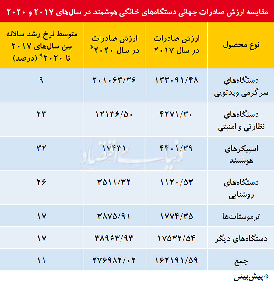 کارشناسان پیشبینی کردهاند که صادرات جهانی دستگاههای سرگرمی ویدئویی شامل تلویزیونهای هوشمند و دیگر دستگاههای مالتی مدیای سرگرمی در فاصله سالهای ۲۰۱۷ تا ۲۰۲۰ متوسط نرخ رشد سالانه ۳/ ۸ درصدی را تجربه خواهند کرد. این کارشناسان معتقدند که متوسط قیمت فروش این محصولات همچنان بالاست و با کاهش قیمت آنها تمایل به خرید در میان مصرفکنندگان هم بیشتر خواهد شد. دستگاههای نظارتی و امنیتی شامل قفل در، دوربینها، حسگرهای رطوبتسنج، زنگ در و ...، همچنان دومین دسته محصولی بزرگ این بازار هستند که در میان مصرفکنندگان محبوبیت خوبی داشته و بهتدریج به یکی از ملزومات خانههای هوشمند آینده تبدیل میشوند. اسپیکرهای هوشمند محبوبترین و پرفروشترین دستگاههای خانگی هوشمند هستند که به کمک دستیارهای صوتی هوشمند طرفداران زیادی پیدا کردهاند. درست به همین دلیل هم هست که سه برند مهم دنیای تکنولوژی یعنی آمازون، گوگل و اپل حضور پررنگی در بازار این اسپیکرهای هوشمند دارند. کارشناسان انتظار دارند بازار اسپیکرهای هوشمند تا چند سال آینده هم با روند رشد سریعی جلو برود.