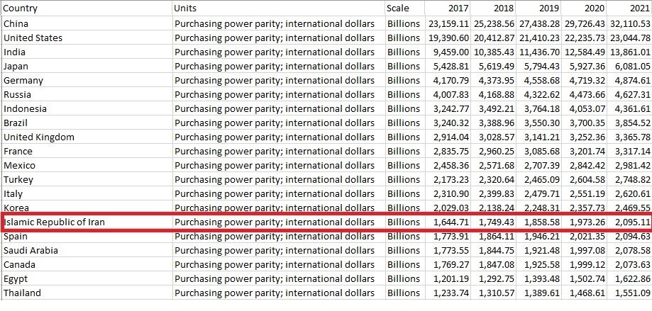 بر اساس آمارهای منتشر شده از سوی این نهاد بین المللی تولید ناخالص داخلی ایران بر اساس شاخص قدرت خرید در سال 2017 بالغ بر 1644 میلیارد دلار بوده و ایران از این نظر در رتبه 18 جهان قرار گرفته است.
