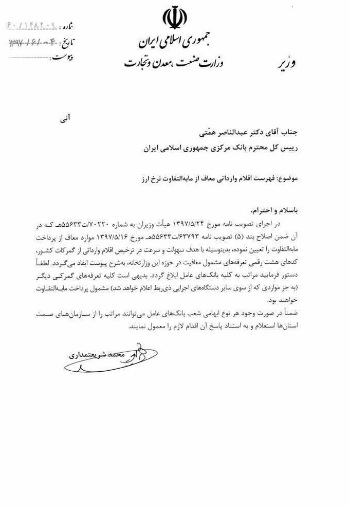 با مکاتبه وزیر صنعت و بانک مرکزی 3479 قلم کالا از پرداخت ما به التفاوت نرخ ارز معاف شدند.