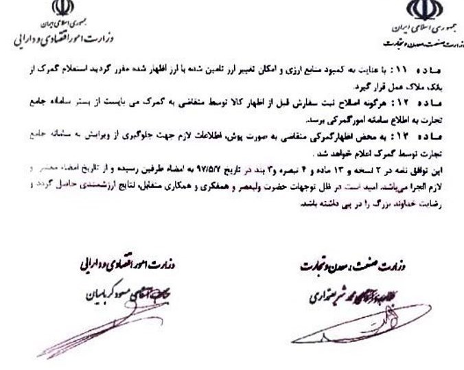 ماده 11: با عنایت به کمبود منابع ارزی و امکان تغییر ارز تامین شده با ارز اظهار شده مقرر گردید استعلام گمرک از بانک ملاک عمل قرار گیرد.