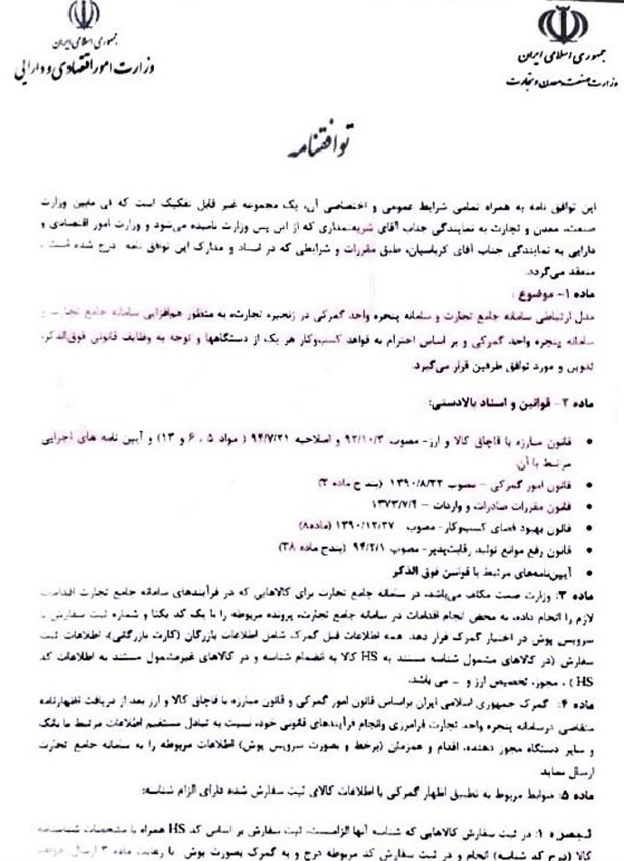 در ابتدای متن این تفاهم نامه آمده است، این توافقنامه به همراه تمامی شرایط عمومی و اختصاصی آن یک مجموعه غیرقابل تفکیک است که فی مابین وزارت صنعت، معدن و تجارت به نمایندگی جناب آقای شریعتمداری که از این پس وزارت نامیده می شود و وزارت امور اقتصادی و دارایی طبق مقررات و شرایطی که در اسناد و مدارک این توافق نامه درج شده است منعقد می گردد.