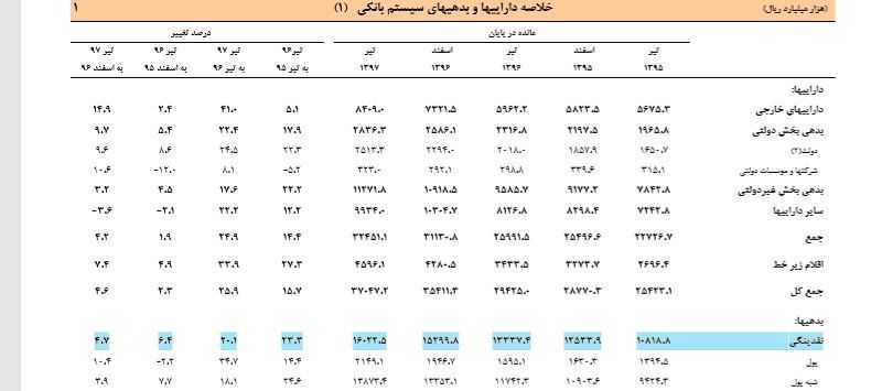 حجم نقدینگی نسبت به اسفندماه سال گذشته 4.7 درصد و نسبت به مدت مشابه سال قبل (تیر 97 نسبت به تیر 96)، 20.1 درصد افزایش نشان میدهد.