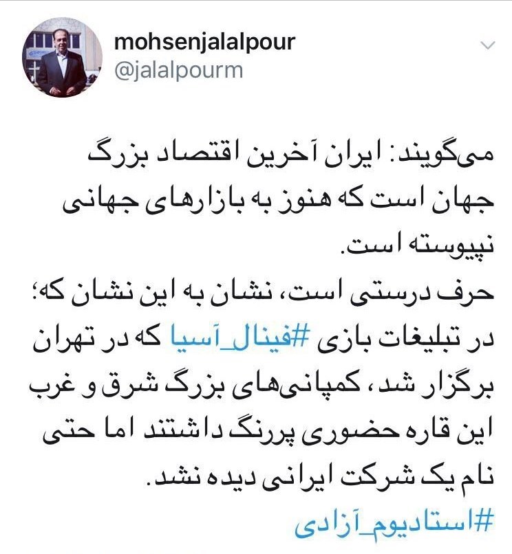 محسن جلال پور رئیس سابق اتاق بازرگانی در توئتیرمیگویند: ایران آخرین اقتصاد بزرگ جهان است که هنوز به بازارهای جهانی نپیوسته است. حرف درستی است، نشان به این نشان که؛ در تبلیغات بازی فینال آسیا که در تهران برگزار شد کمپانی های بزرگ شرق و غرب این قاره حضوری پررنگ داشتند اما حتی یک شرکت ایرانی دیده نشد.