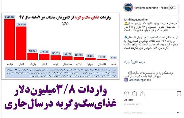 صفحه اینستاگرامی فرهیختگان آنلاین با انتشار جدولی از آمار واردات نوشت: در سال جاری با وجود التهابات ارزی و اعمال تحریمها، حدود سه میلیون و ۸۱۰ هزار و ۳۱۷ دلار غذای سگ و گربه وارد کشور شده است! این درحالی است که دولت در اوایل تابستان واردات ۱۳۳۹ قلم کالای لوکس و غیرضروری را ممنوع کرده بود، اما جالب است که غذای سگ و گربه جزء کالای لوکس قرار نگرفته است!