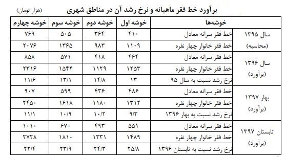 بر اساس مفاد اعلام شده در جدول بالاترین خط فقر ماهیانه برای شهرستان تهران به دست آمده که در سال ۱۳۹۵برای یک خانوار چهار نفره دو میلیون و هفتادوشش هزار تومان محاسبه شده و در تابستان ۱۳۹۷ در حدود دو میلیون و هفتصدوبیست وهشت هزار تومان برآورد شده است. نکته قابل توجه آنکه خط فقر تهران تنها در تابستان ۱۳۹۷ نسبت به بهار ۱۳۹۷، در حدود سیصد هزار تومان برای یک خانوار چهار نفره افزایش داشته که این موضوع میتواند نشاندهنده قرار گرفتن افراد بیشتری در زیر خط فقر درسال ۱۳۹۷ نسبت به سالهای قبل باشد.