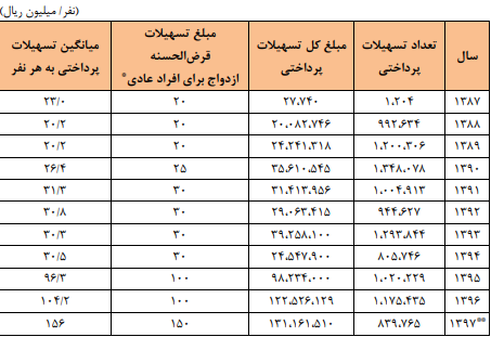 پرداخت تسهیلات قرضالحسنه یکی از سیاستهای دولت در حمایت از ازدواج جوانان از سالهای ابتدایی دهه ۸۰ تاکنون بوده است. از انتهای سال ۸۷ همزمان با افزایش مبلغ تسهیلات قرضالحسنه ازدواج از ۱۰ به ۲۰ میلیون ریال، پرداخت این تسهیلات در قالب سامانه متمرکز تسهیلات قرضالحسنه ازدواج پیگیری شده است. تعداد، مجموع و میزان تسهیلات قرضالحسنه پرداخت شده در سالهای اخیر در جدول زیر آمده است: