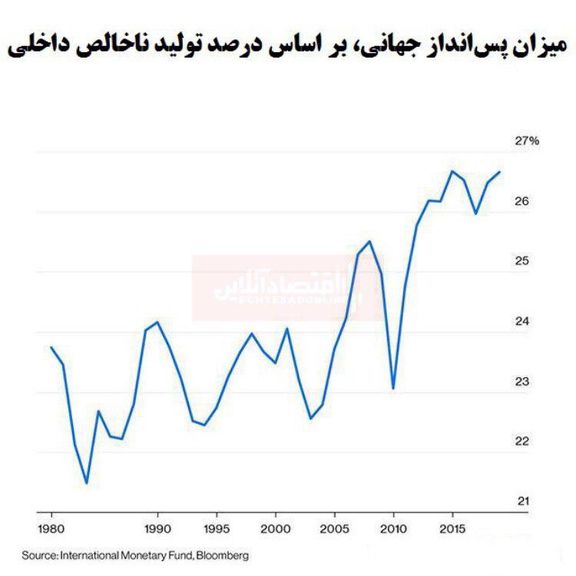 در نمودار ارائه شده، گزارش صندوق بین‌المللی پولدر خصوص میزان پس‌انداز جهانی، بر اساس درصد تولید ناخالص داخلی را مشاهده می‌کنید؛