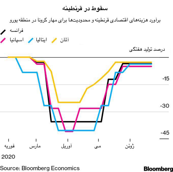 نمودار زیر که از خبرگزاری بلومبرگ برداشته و به فارسی برگردانده شده است، آخرین شواهد از هزینه قرنطینه را نشان می‌دهد: