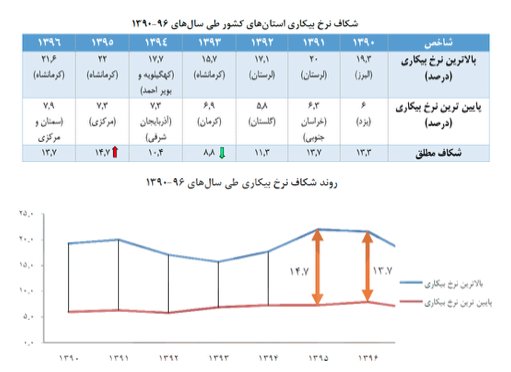 آمار مقایسه ای پایین ترین نرخ بیکاری با بالاترین نرخ بیکاری استانها به استناد یافتههای مرکز آمار ایران طی ۶ سال اخیر حاکی از آن است که طی سالهای ۹۰ تا ۹۶ بیشترین شکاف نرخ بیکاری در بین استانها مربوط به سال ۹۵ است به این ترتیب که در این سال بالاترین نرخ بیکاری با ۲۲ درصد مربوط به استان کرمانشاه و پایین ترین نرخ بیکاری نیز مربوط به استان مرکزی با نرخ ۷.۳ درصد بود؛ بنابراین شکاف مطلق نرخ بیکاری در این سال معادل ۱۴.۷ درصد بود.