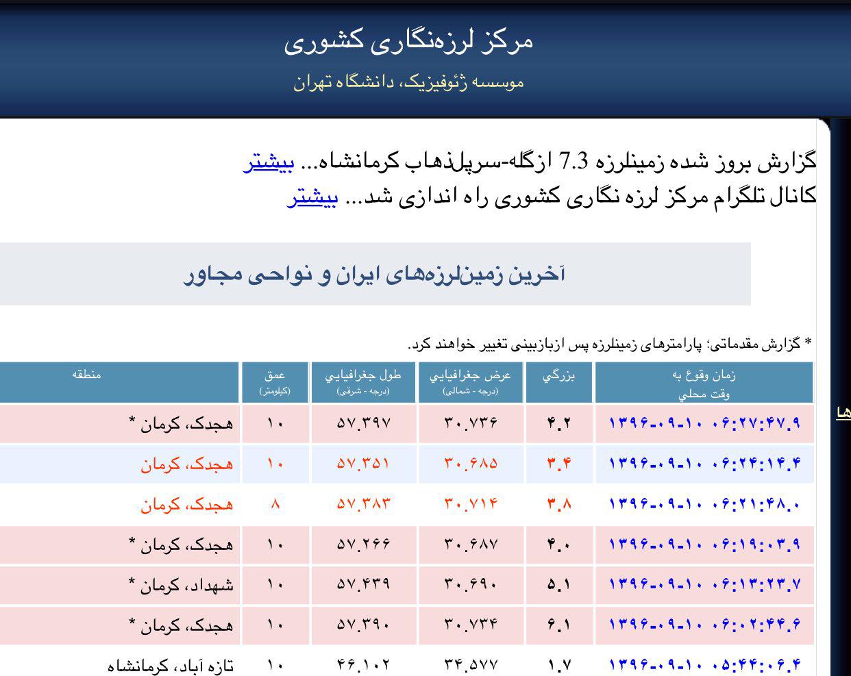 9:10- طبق آخرين آمار مرکز زلزله نگاری کشور از صبح امروز تا به اين لحظه مناطق مختلف استان کرمان از جمله هجدک، چترود، شهداد و كهنوج بالاى ٣٠ بار لرزیدهاند.